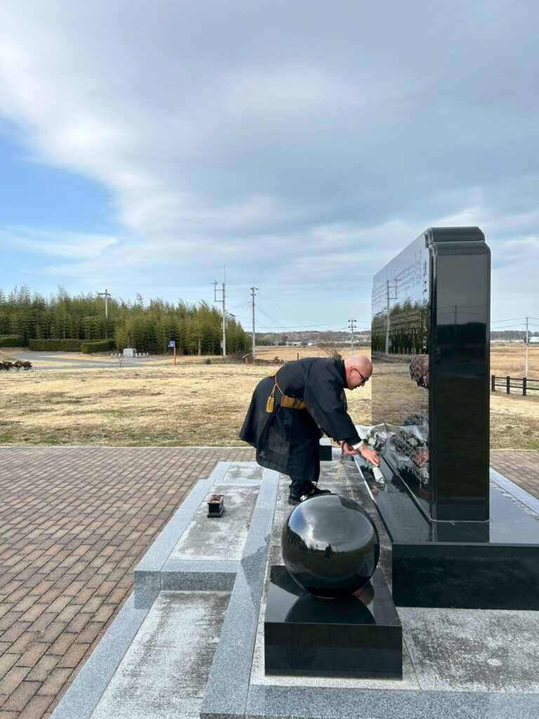 その後、隣町の浪江町にある町営大平山(おおひらやま)霊園に移動しました。大平山は、標高40メートルほどで、丘の上からは海が望めます。海まで直線で約2キロほどの間は建物のない平地が広がっていて、かつてこの地に人々の賑わいがあったのかと思うと「無常」という言葉が胸に浮かびました。2011年3月11日の大地震後、海から内陸に約300メートルのところに建っていた請戸(うけど)小学校の校舎にいた児童83人と教職員は、ここまで歩いて避難し、全員無事に助かり、「児童たちを救った山」として、語り継がれているそうです。