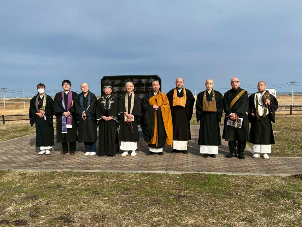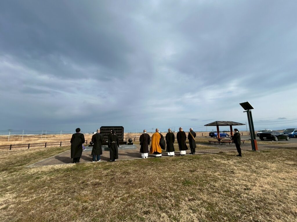 慰霊碑に献花し、その前で参加者の所属教団毎に8通りの追悼儀礼を行ないました。また、地震が発生した午後2時46分には全員で黙祷を捧げ、東日本大震災で犠牲になられた方々のご冥福をお祈りしました。儀礼の間、冷たい風が吹き、気温は低めでしたが、50分ほどで無事終了することができ、皆で追悼法要をすることの深い意義を感じました。